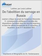 Lubliner, L. De l'abolition du servage en Russie : examen critique du projet de l'empereur Alexandre II : consequences politiques et sociales des dispositions decretees dans les rescrits imperiaux et dans les offices ministeriels du 21 novembre - 3 decembre, et du 5-17 decembre 1857 / par Louis Lubliner; L. Lubliner .— : Imprimerie et lithographie de Ch. Vanderauwera, 1858 .— 94 с. — Lang: fre .— URL: https://rucont.ru/efd/128323 (дата обращения: 16.11.2025)