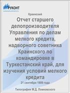 Краинский. Отчет старшего делопроизводителя Управления по делам мелкого кредита, надворного советника Краинского по командировке в Туркестанский край, для изучения условий мелкого кредита : 21 сентября 1909 года / Краинский .— : Типография М.Д. Ломковского, 1909 .— 102 с. — URL: https://rucont.ru/efd/123426 (дата обращения: 05.12.2025)