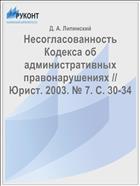 Липинский1 Несогласованность Кодекса об административных правонарушениях До принятия нового Кодекса об административных правонарушениях ответственность за их совершение была предусмотрена КоАП РСФСР, специальными законами об административной ответственности, отдельными нормативно-правовыми актами, предусматривающими административную ответственность. <...> Постоянно вносящиеся изменения в нормативно-правовые акты, предусматривающие административную ответственность, приводили к их несогласованности, дублированию одних норм другими. <...> В частности, ФЗ «О введении в действие кодекса РФ об административных правонарушения»2 исключены из Таможенного кодекса РФ нормы об ответственности за таможенные правонарушения, т.к. последние специально включены в Кодекс об административных правонарушениях. <...> Из различных нормативно-правовых актов, предусматривающих административную ответственность, исключены соответствующие нормы и помещены в КоАП РФ. <...> Например, из ФЗ «Об 1 Сведения об авторе: кандидат юридических наук, доцент Волжского ун-та им. <...> 1 усилении ответственности за самовольную добычу янтаря»3 исключена ст. <...> КоАП РФ «законодательство об административных правонарушениях состоит из настоящего Кодекса и принимаемых в соответствии с ним законов субъектов РФ об административных правонарушениях». <...> Из этого положения и понятия административного правонарушения следует, что все административные правонарушения должны быть изложены в федеральном нормативноправовом акте КоАП РФ и на федеральном уровне, кроме указанного Кодекса, не должно существовать нормативно-правовых актов, предусматривающих составы административных правонарушений и ответственность за их совершение. <...> Однако законодатель не до конца последователен в своей идее, т.к. она требовала детальной разработки сопутствующего КоАП РФ ФЗ «О введении в действие кодекса РФ об административных правонарушениях», а из последнего следует <...>