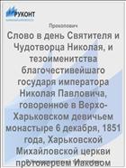 Прокопович, И. Слово в день Святителя и Чудотворца Николая, и тезоименитства благочестивейшаго государя императора Николая Павловича, говоренное в Верхо-Харьковском девичьем монастыре 6 декабря, 1851 года, Харьковской Михайловской церкви протоиереем Иаковом Прокоповичем / И. Прокопович .— : В Университетской типографии, 1852 .— 22 с. — URL: https://rucont.ru/efd/50683 (дата обращения: 11.12.2025)