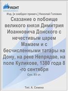 Сказание о побоище великого князя Димитрия Иоанновича Донского с нечестивым царем Мамаем и с бесчисленными татары на Дону, на реке Непрядве, на поле Куликове, 1380 года 8-го сентября : Соч. XV ст. / Изд. [и снабдил примеч.] Николай Головин .— : Тип. А. Семена, 1835 .— 34 с. — URL: https://rucont.ru/efd/51476 (дата обращения: 14.12.2025)